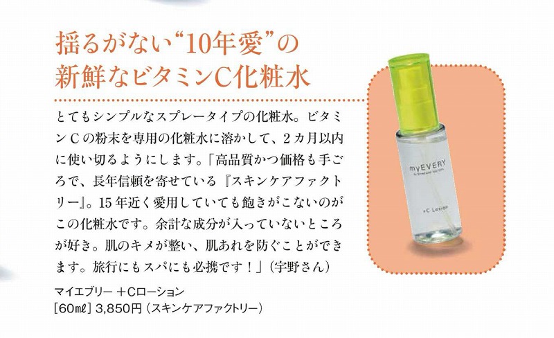 ハースト婦人画報社 婦人画報2月号 偏愛美容のすすめ 美容ライター宇野ナミコ様「揺るがない“10年愛”の新鮮なビタミンC化粧水」としてmyEVERY+Cローションが紹介されました。
