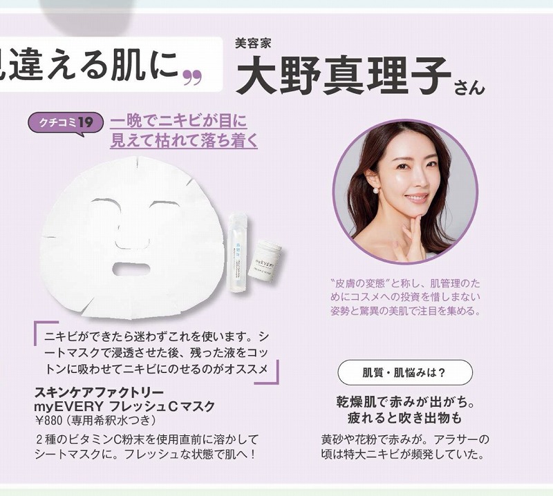 講談社VOCE3月号 「本当に肌が変わった!大クチコミ集 集中ケアするマスク&パックで見違える肌に」 美容家 大野真理子様のおすすめとしてmyEVERYフレッシュCマスクが紹介されました。